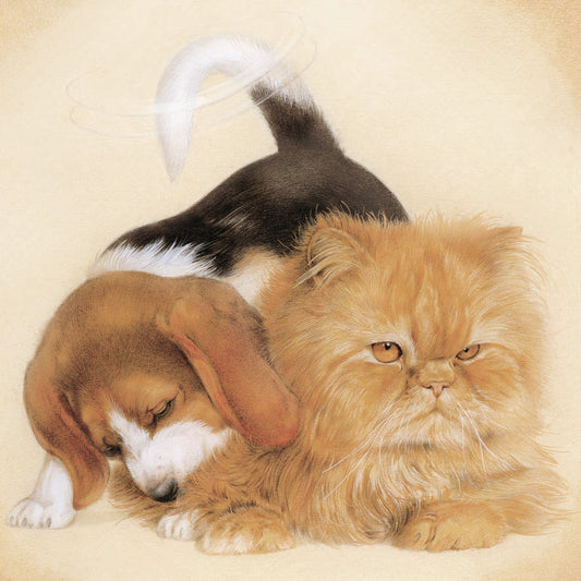 Vierkante kaart - Beagle en Pers nuttigen samen een stukje taart (hond en kat)