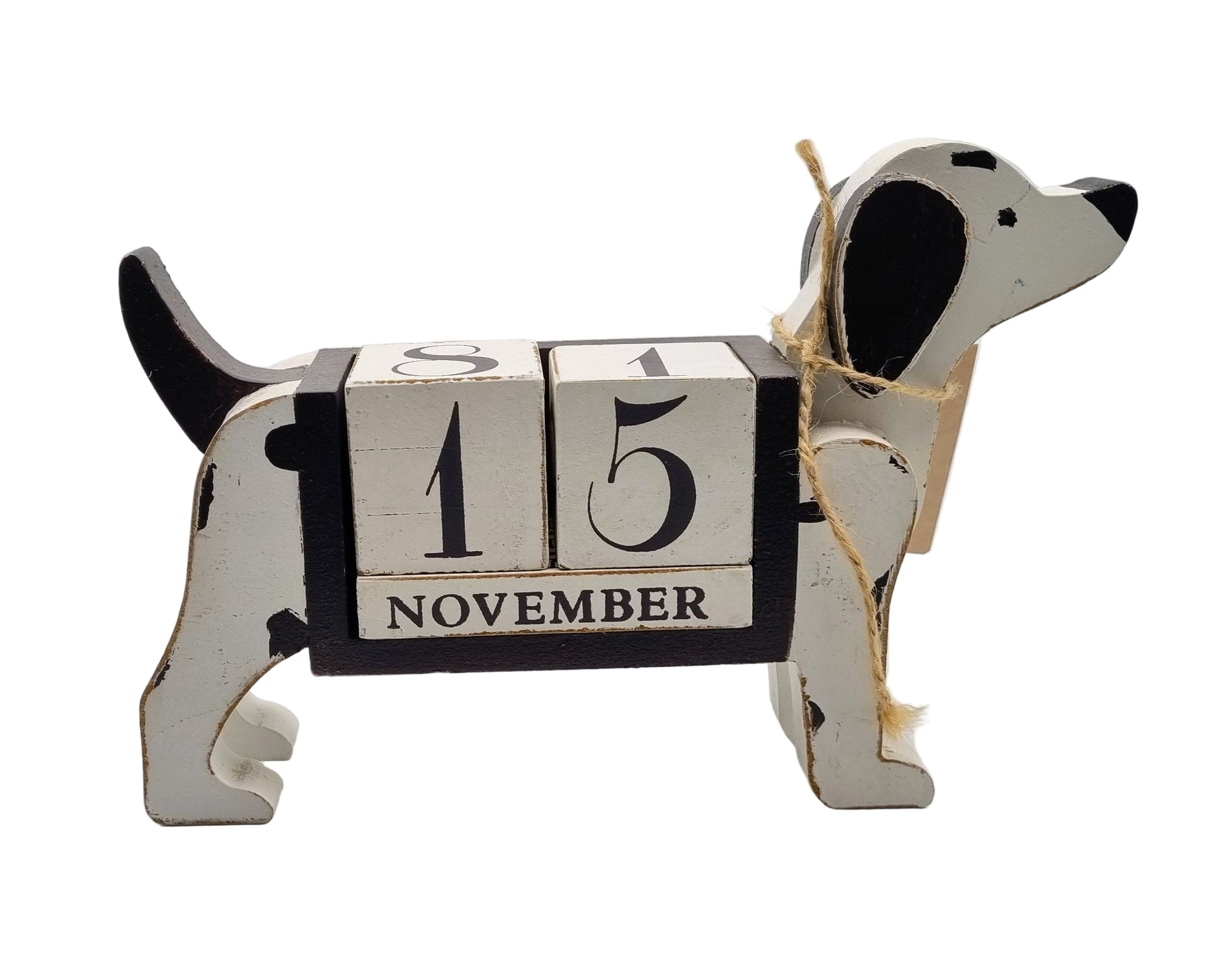 Houten hond met variabele kalender in de vorm van blokken. Alle datums zijn mogelijk!!