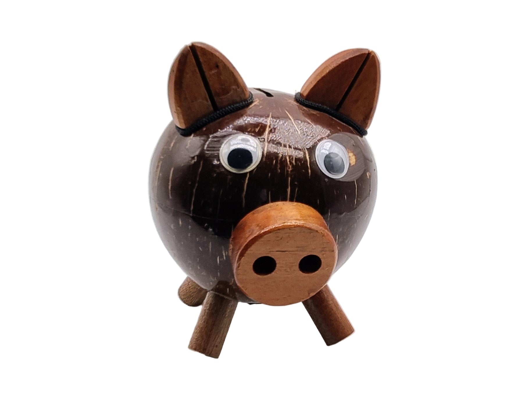 Je moet er maar opkomen. Een omgebouwde kokosnoot, nu te gebruiken als spaarvarkentje. Zeer decoratief en beperkte oplage.